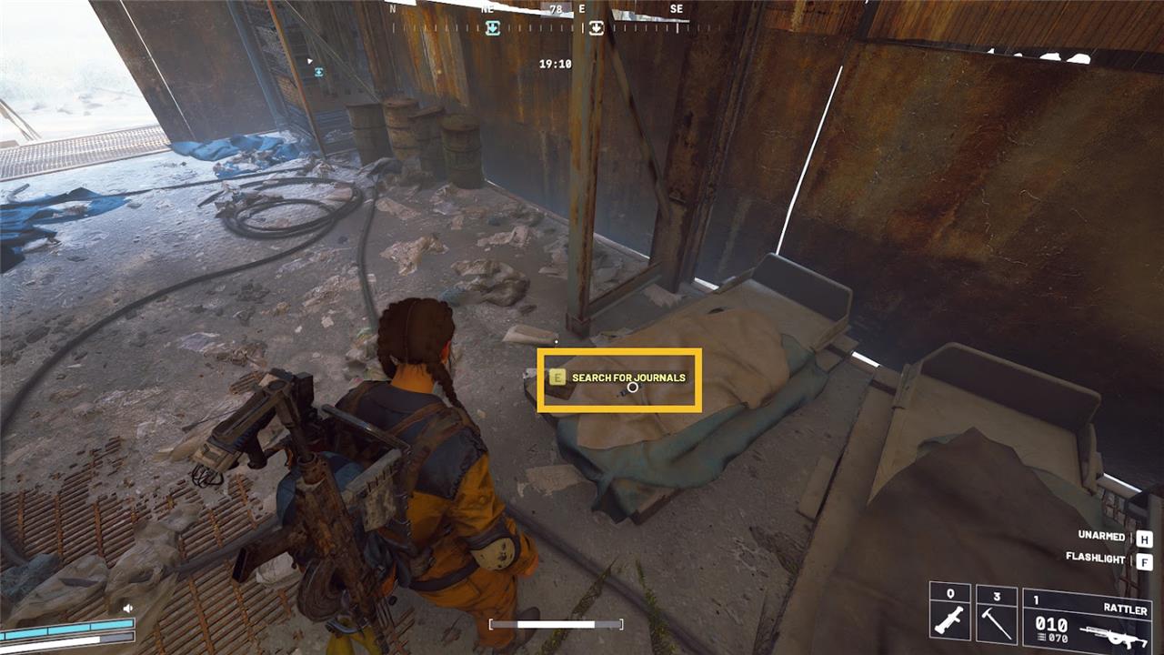 Once you reach the outpost, head inside the central circular building and then into the attached corridor room. On the floor, you’ll spot a bed with a yellow ‘Search for Journals’ prompt. Search the bed, and the journals will drop, so make sure you pick them up and stow them in your inventory before leaving.