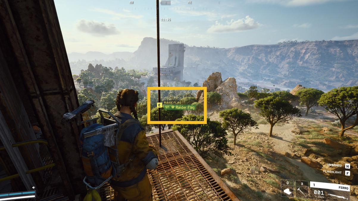 Continue further into the Outpost, and when you reach a circular room, walk to the balcony platform directly ahead of you. On your left, you’ll see a flagpole with a yellow ‘Raise Flag’ prompt. Raise the flag to complete the final objective.
