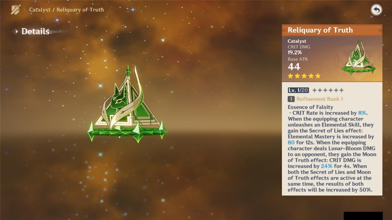 - Reliquary of Truth (signature): Highest CRIT DMG, extra CRIT Rate, and a large EM buff when using Skill and triggering Lunar-Bloom, tailored exactly to her kit so it stays 15-20% ahead of other options at all constellations.