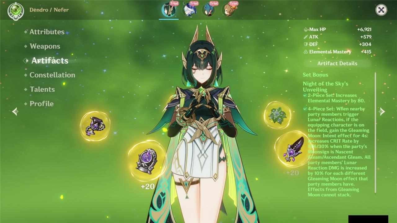 The best artifact for Nefer in Genshin Impact is Night of the Sky’s Unveiling. You need to complete the 4-pc set as it synergizes perfectly with the character. The two-piece bonus gives you 80 Elemental Mastery, which is massive.