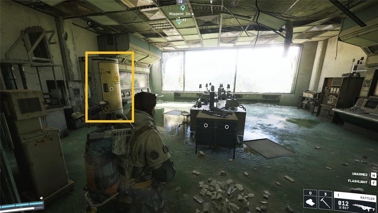 On the left side of the room, you’ll spot a large metal cylinder with “Cryogenic Hazard” on the front below a snowflake warming sticker. When you approach, you’ll see a prompt to “Secure Seeds.” Interact with the cylinder and then pick up the Experimental Seed Sample that drops to the ground.